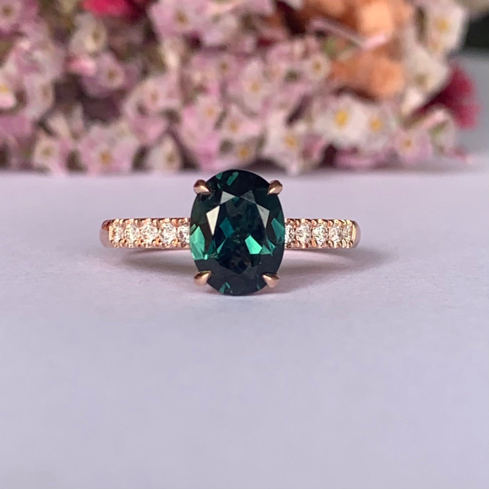Teal Australian Oval Sapphire from Rubyvale in QLD & is set with four claws. The stone is beautifully complimented by ten 1.5mm 1 1/2 pt Round...