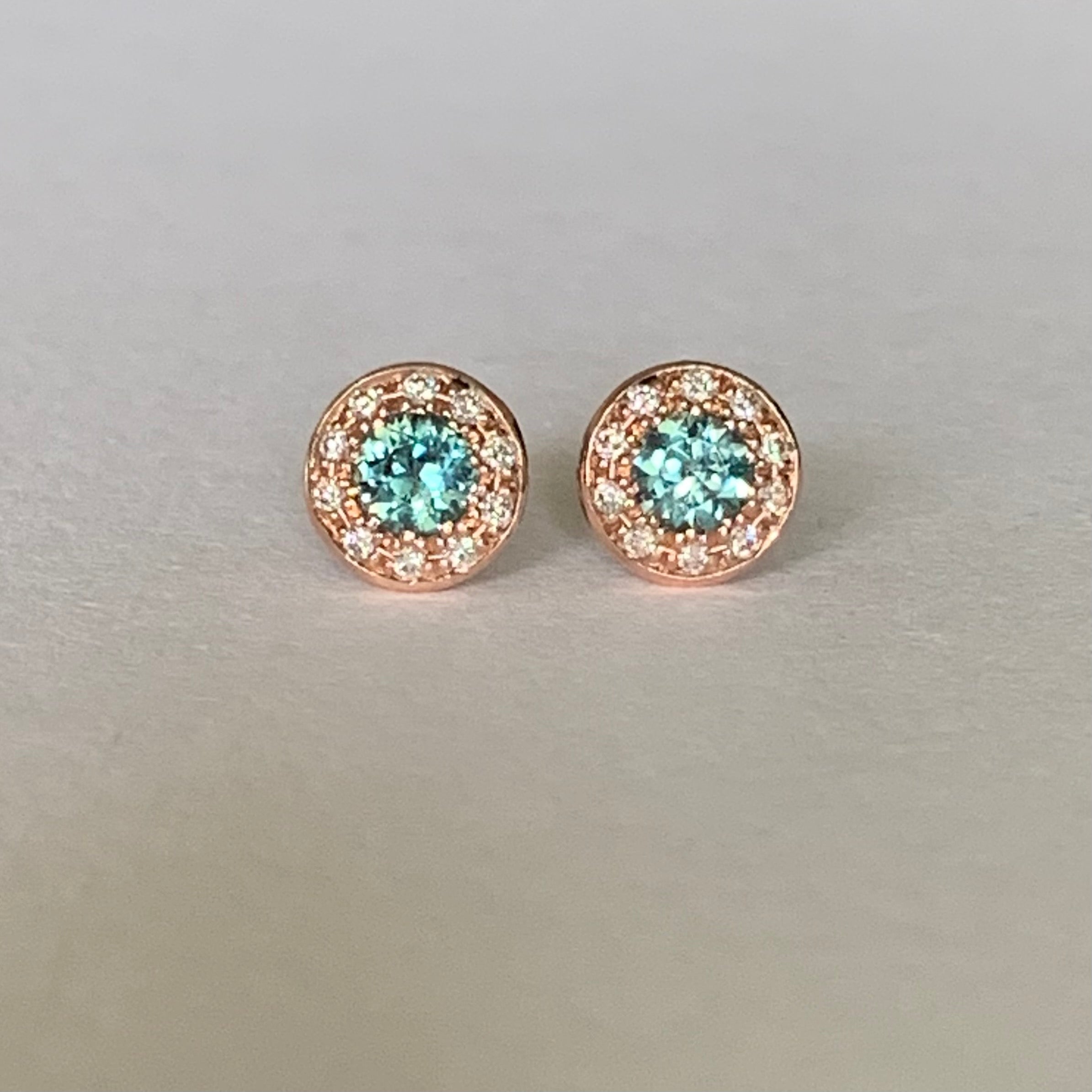 These beautiful 14ct Rose gold pair of earrings are bead set with a pair of Australian Teal Parti Sapphires & halo of diamonds. The teal Sapphires...