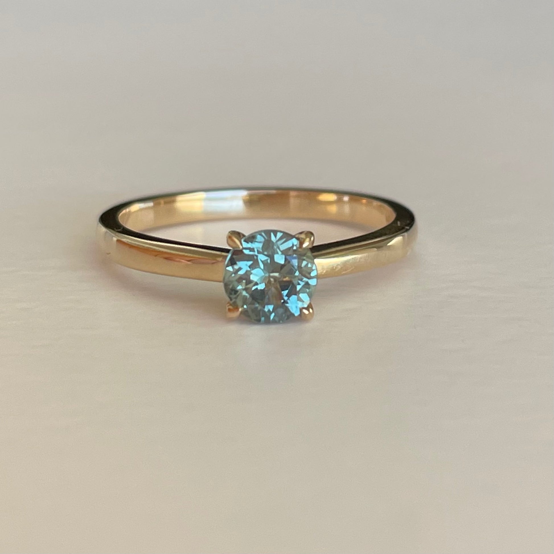 This Solitaire Chloe Ring is beautifully complimented by a 0.69pt light Blue/ Green Australian Parti Sapphire, the stone is set with four eagle shaped claws in yellow gold.