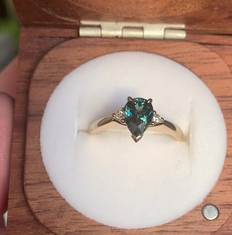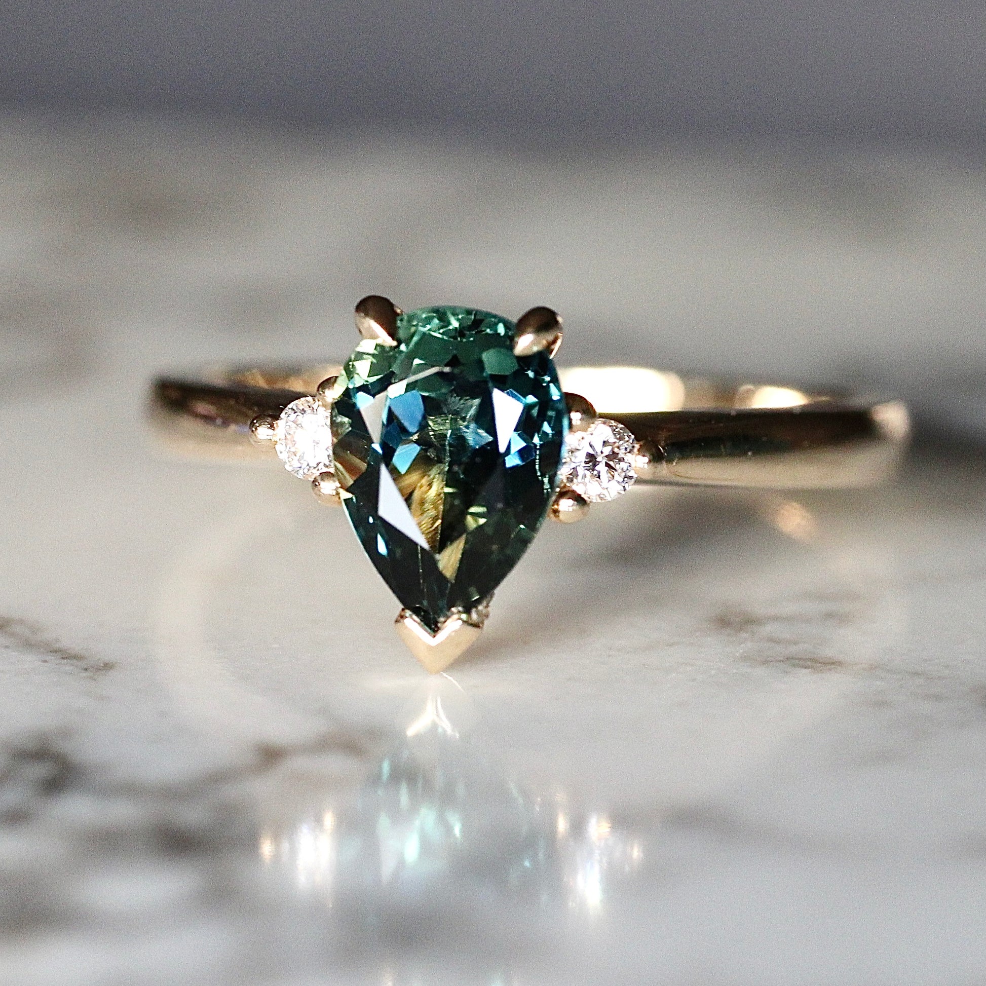 Pear shaped Teal Sapphire & Diamond Trio Ring