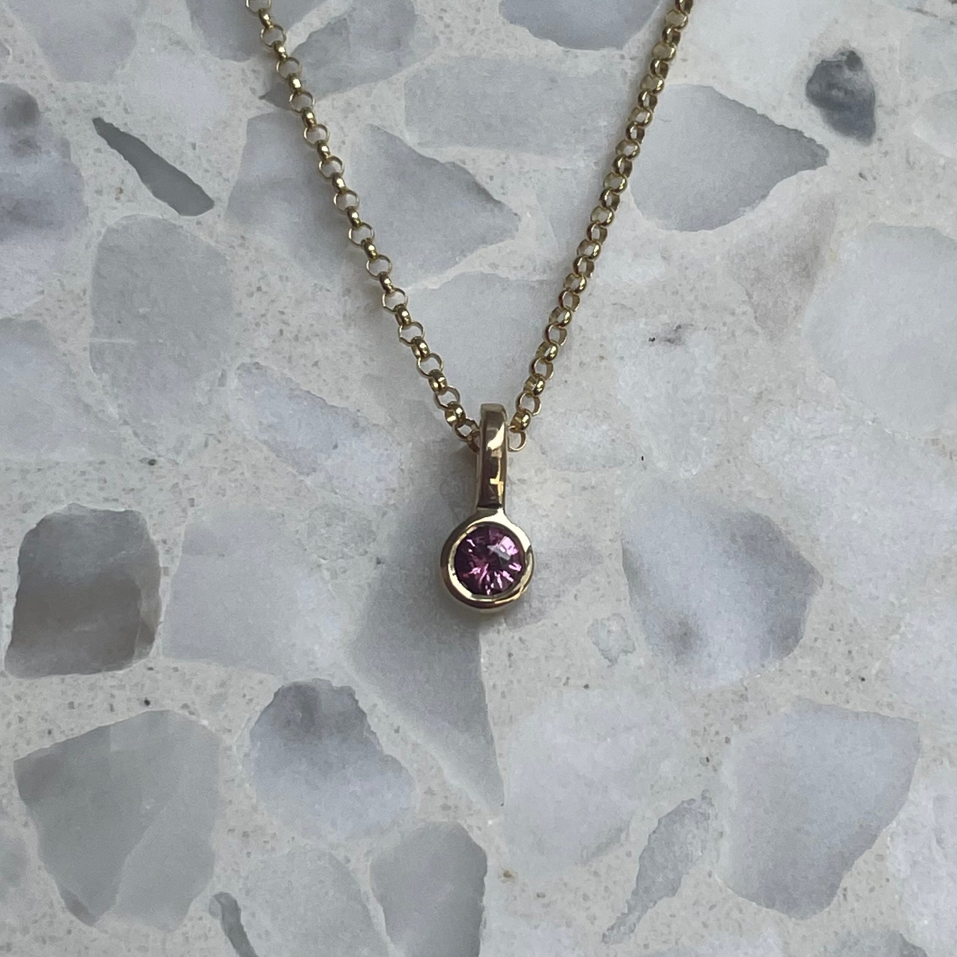 Round Cut Pink Australian sapphire pendant paired with a fine 0.9mm 9ct yellow gold trace chain. The clean lines and pink hues of the 3mm sapphire create a timeless, elegant look.