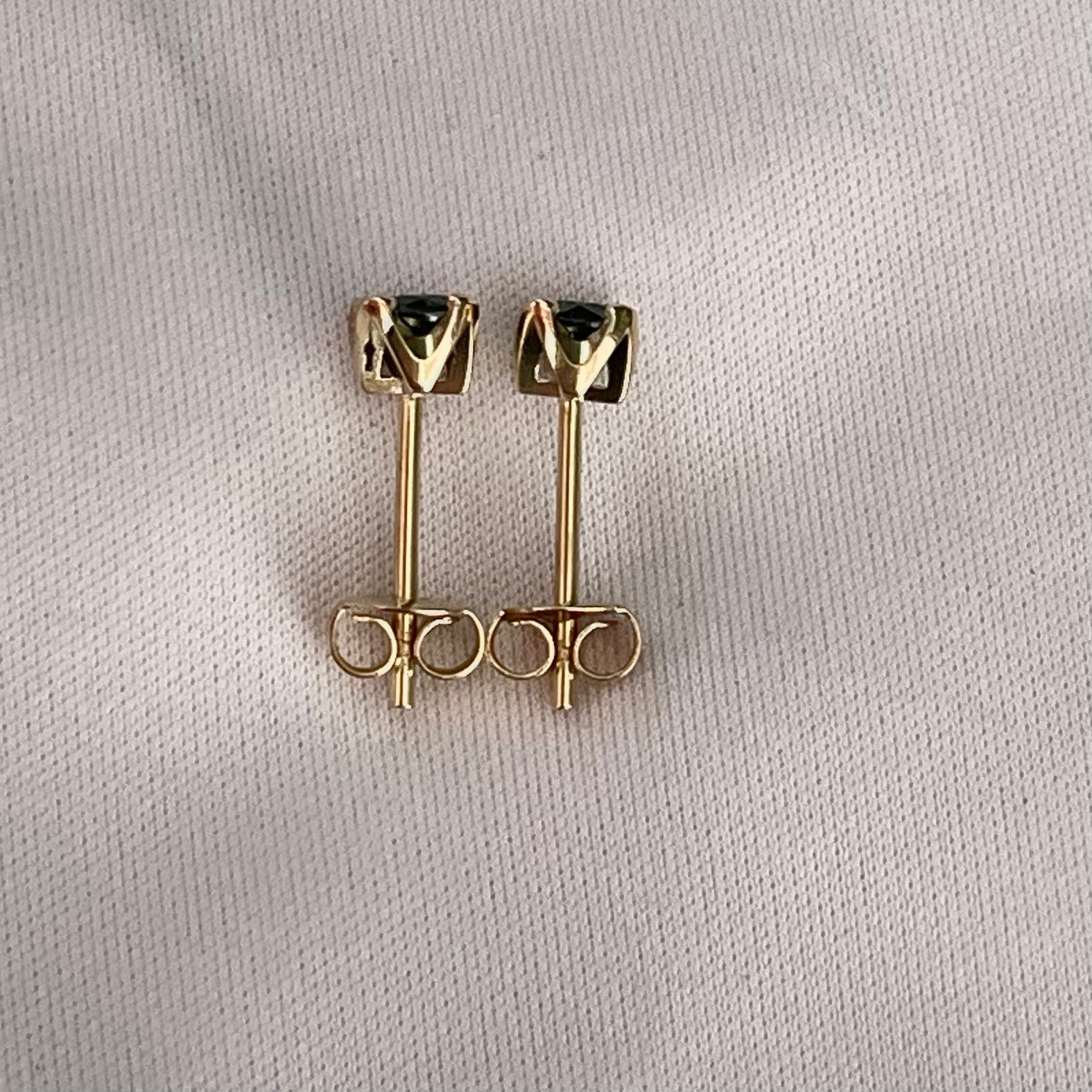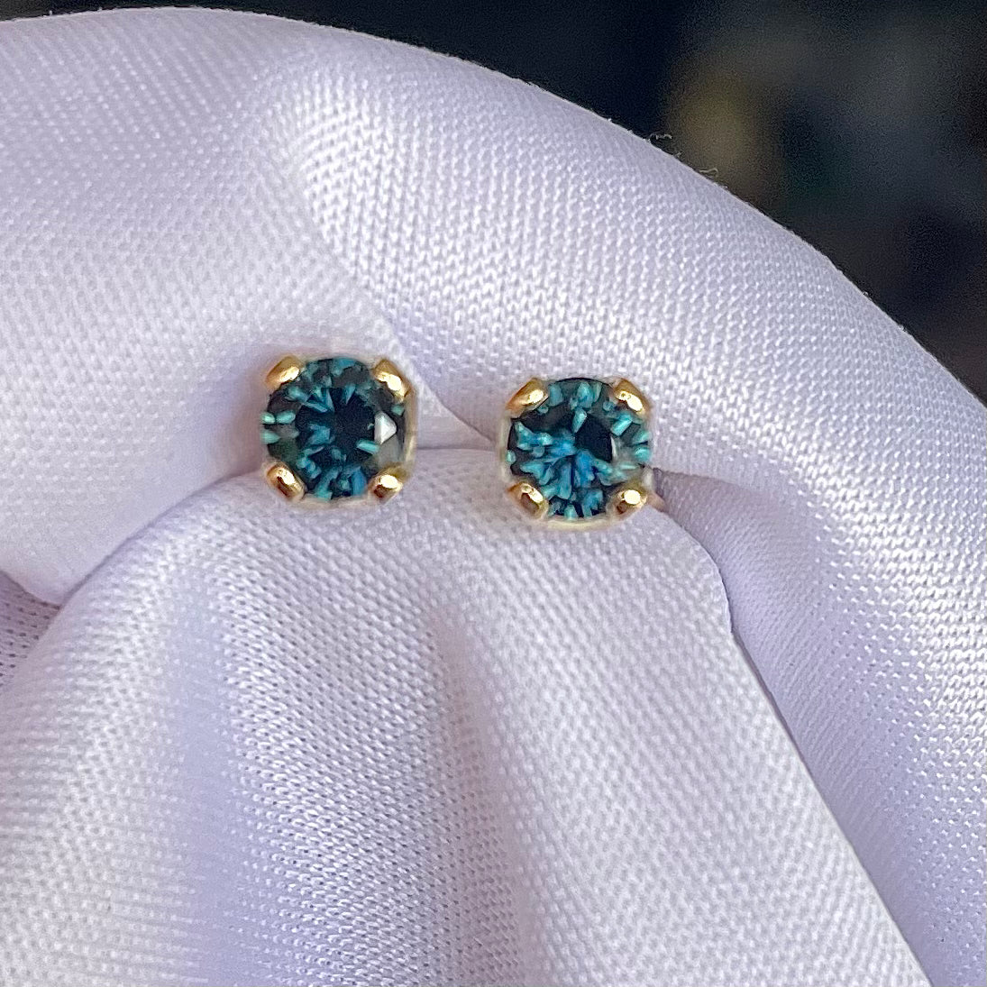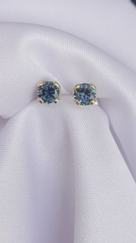 Teal Australian Sapphire Four claw earring, set in 18ct yellow gold. The stones are approx: 4.2mm around cut and total weight is approx. 0.70ct